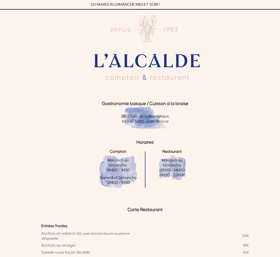 A l'occasion de la réouverture du restaurant Alcalde à saint-jean-de-luz, nous avons été chargé de créer un site vitrine pour celui-ci.